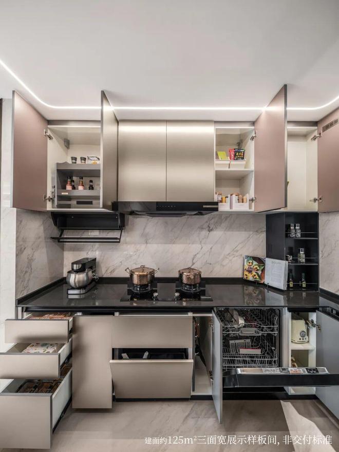 全屋集成海量收纳系统,配备多功能餐边柜、定制橱柜与双面镜柜等,拓展相当于一间卧室的储物容量,容纳生活美好想象,让家越住越从容。