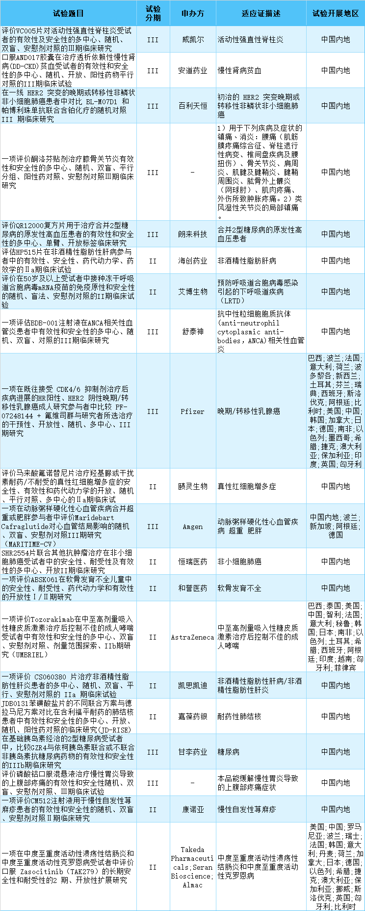 根据医药魔方提供的数据,9月8日至9月12日,国家药品监督管理局药品审评中心共披露51条临床试验登记信息。记者注意到,其中包括20条处于临床试验II期及以上的临床试验登记信息,针对肿瘤、皮肤、免疫、消化等多个领域。